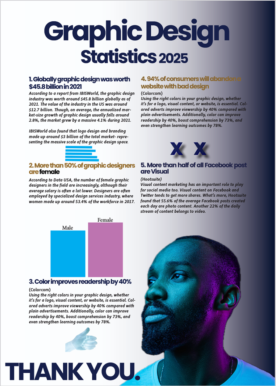 This infographic was designed in Adobe InDesign to showcase my understanding of visual hierarchy, balance, and structured layout. Using five data points from a graphic design statistics source, I translated complex information into clear, original visuals supported by minimal text for easy comprehension.